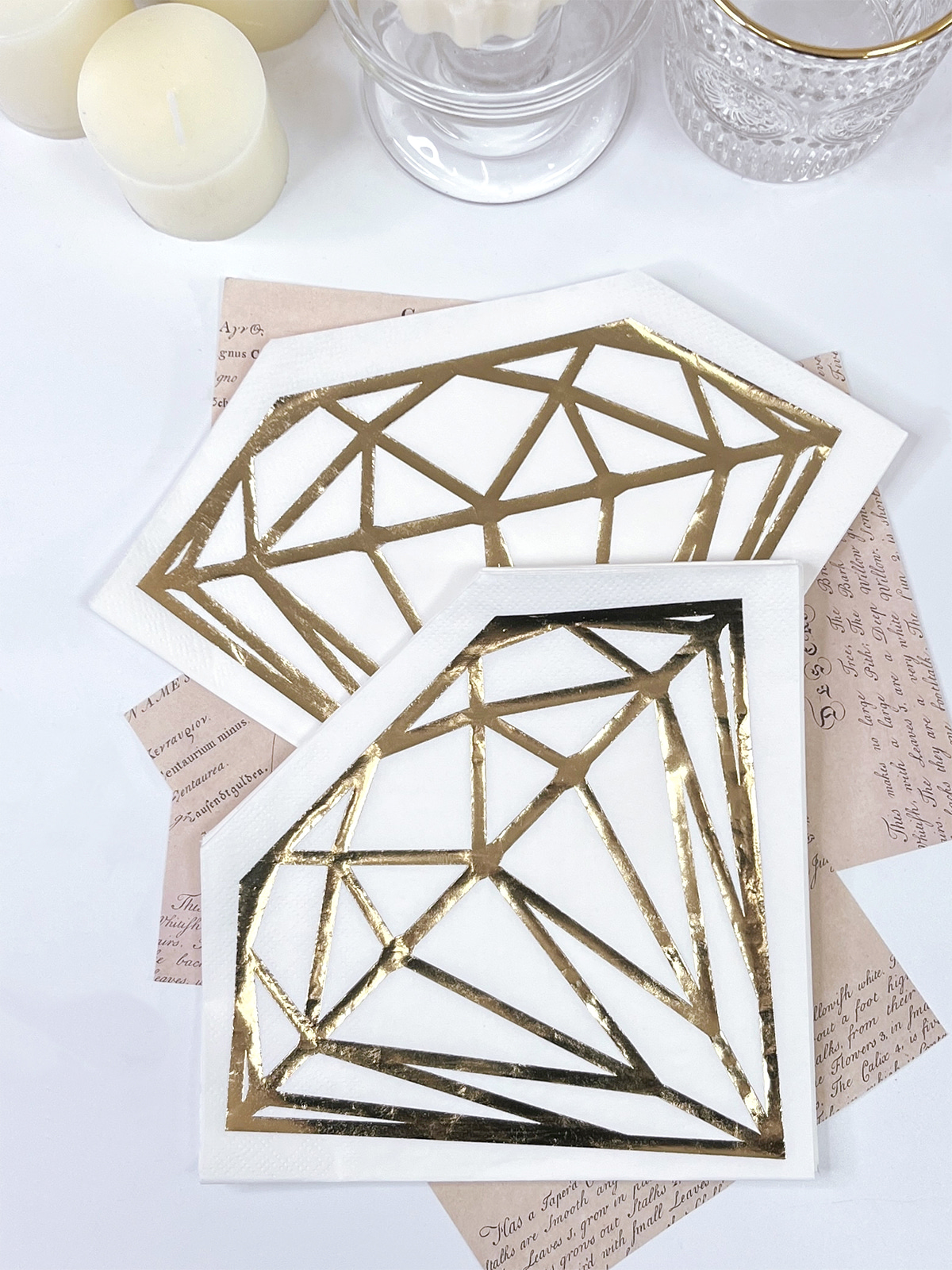 تتميز المناديل الورقية الماسية الرائعة بطباعة رقائق ذهبية أنيقة وزخارف تصميمية مقطوعة بالقالب، مما يضيف لمسة من الحداثة والرقي إلى مناسباتك الخاصة. أبهر ضيوفك في حفلات الزفاف وديكور العروض وحفلات الزفاف وحفلات الخطوبة بهذه المناديل المذهلة.
